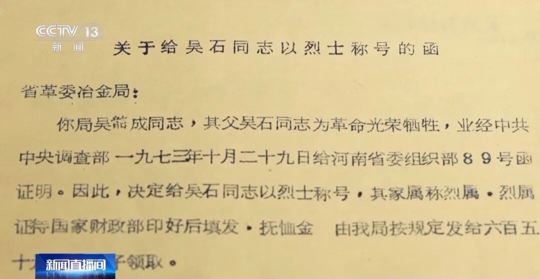 除这份新近鉴别出的履历表外,河南省档案馆还保存有1973年《关于给吴石同志以烈士称号的函》以及向其家属发放光荣纪念证的相关档案存根。