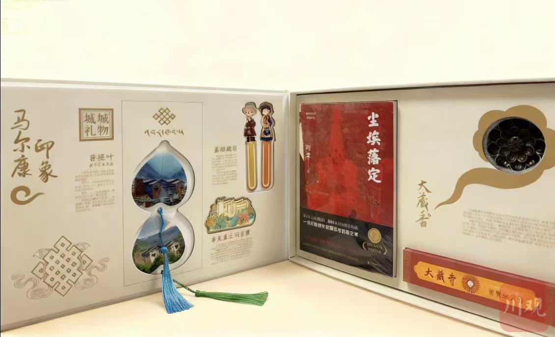 打开礼盒,一本《尘埃落定》、一枚铜香插、一盒藏香,搭配菩提叶唐卡书签、卓克基土司官寨冰箱贴等,营造出“藏香袅袅品书香”的静谧体验。“《尘埃落定》的故事就发生在马尔康卓克基土司官寨。我们希望通过这个礼盒,让游客沉浸式感受本地文化。”王姆介绍。盒内一张写有浙川协作“山海情”的卡片,则传递着平阳县与马尔康市之间的深情厚谊。