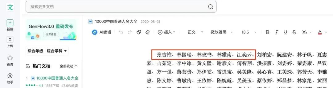 据记者12月4日检索发现,评审小组成员为“张吉惟、林国瑞、林玟书、林雅南、江奕云”。在百度搜索“10000中国普通人名大全”,该文档中前5个人名也为“张吉惟、林国瑞、林玟书、林雅南、江奕云”。二者完全重合。