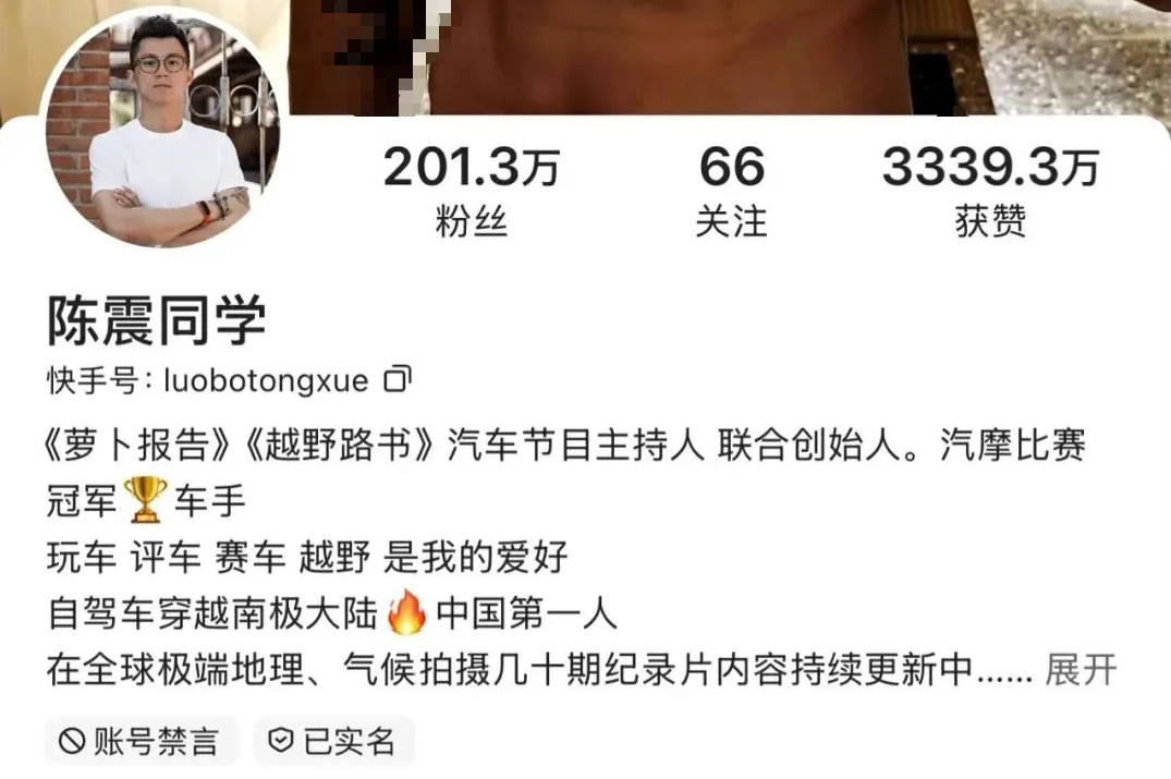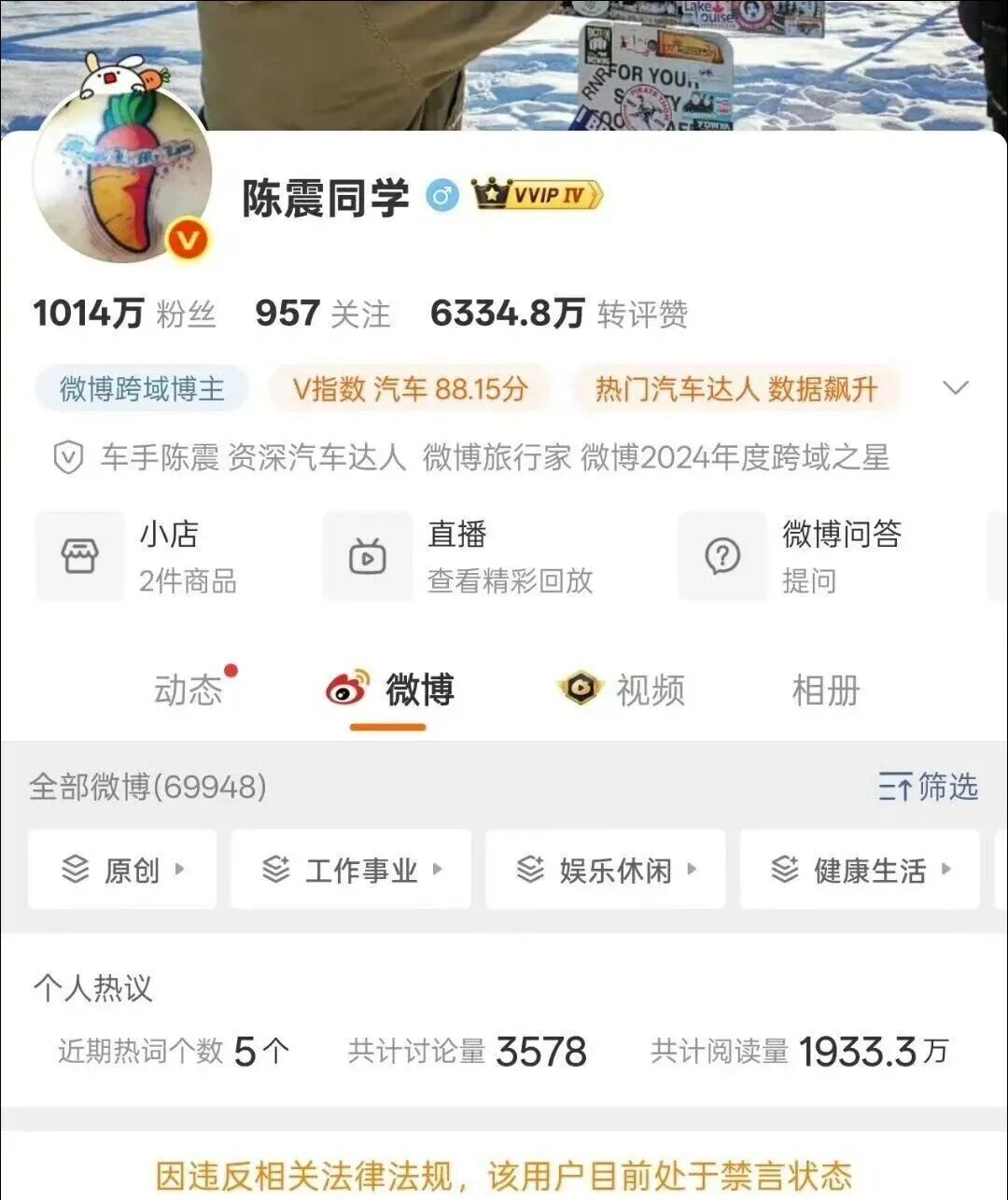 5日凌晨,不少网友发现车圈大V陈震突然被禁言。微博、抖音、快手、小红书平台显示,该用户因违反相关法律法规和政策,已被禁言。B站则显示账号已被封禁。