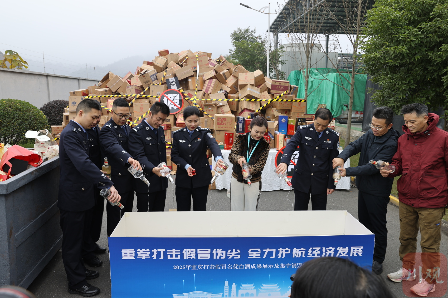 12月5日,宜宾市公安局2025年打击假冒名优白酒成果展示及集中销毁活动在宜宾市珙县举行,现场对近年侦破案件中查获的假酒及制假物料进行了集中销毁。 本次销毁的假冒伪劣物品数量巨大,包括假冒五粮液、茅台、泸州老窖等品牌的成品及半成品酒17600瓶,各类假冒包装材料(酒瓶、酒盒等)86520余件(套),以及激光打码机等制假工具84件。据统计,仅现场销毁的成品、半成品假酒,按市场价格估算,货值就高达2000余万元。