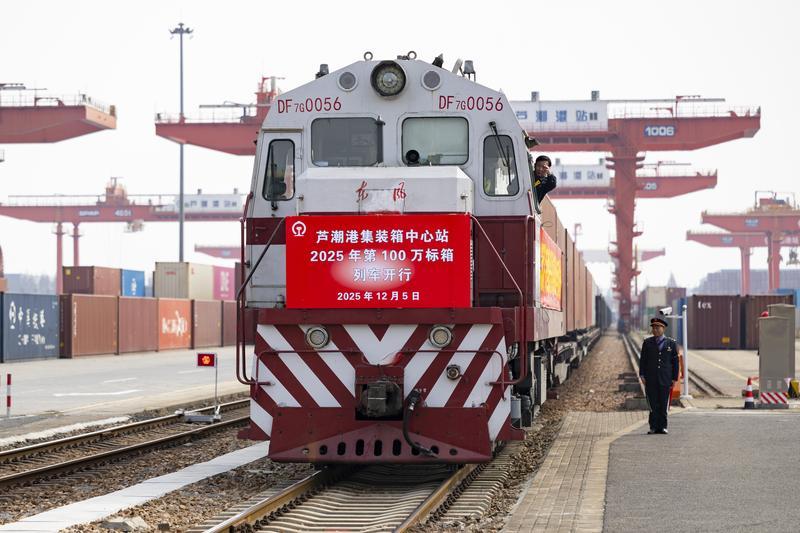12月5日,一趟载有太阳能光伏组件、汽车零配件等货物的海铁联运班列从上海芦潮港集装箱中心站开出,标志着2025年以来上海海铁联运业务量突破100万标箱,同比增长近两成,创历史新高。