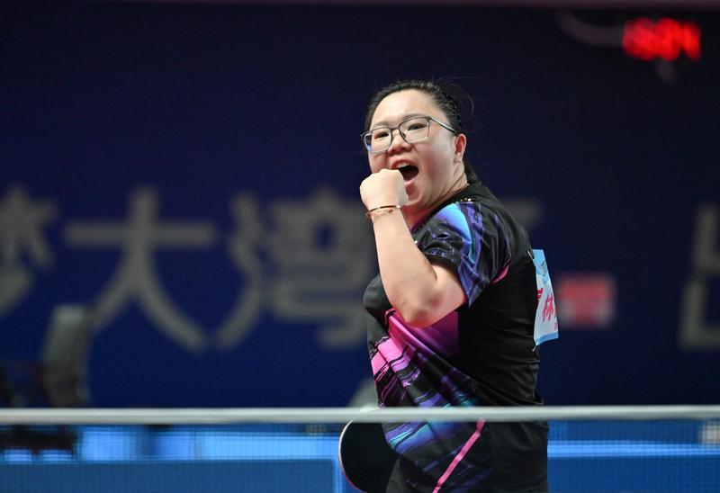 12月5日,陕西队选手林渲淇在TT8-9女子团体小组赛中庆祝。陕西队2比1战胜海南队。