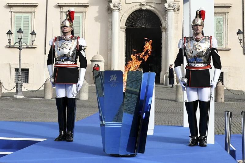 当日,2026年米兰-科尔蒂纳冬奥火炬接力庆典火盆点燃仪式在意大利罗马奎里纳莱宫广场举行。