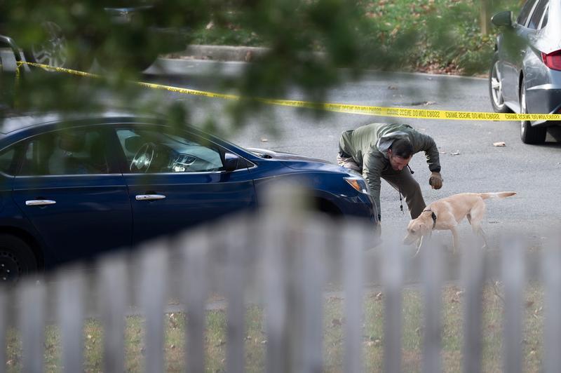 12月4日,在美国弗吉尼亚州伍德布里奇,联邦调查局人员和警犬在逮捕现场工作。