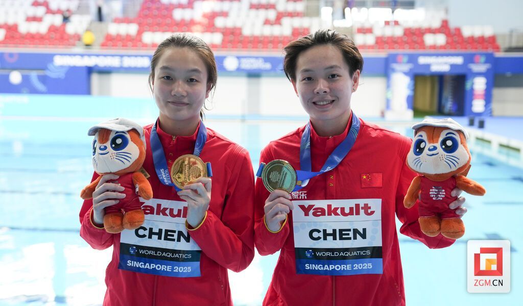 陈佳(左)和陈艺文在2025年世界游泳锦标赛跳水女子双人3米板决赛中夺冠