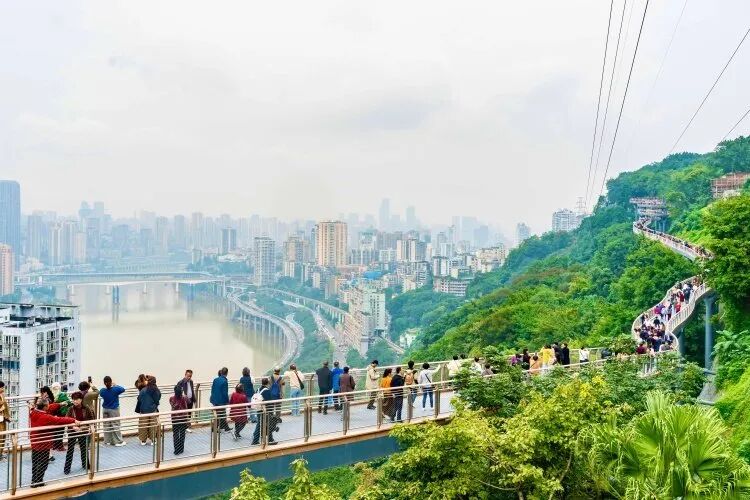 鹅岭栈桥坐落于半山崖线步道鹅岭段,栈桥依山就势、临崖而建,在陡峭的崖壁上蜿蜒穿行,形成一条视野开阔的观江览城步行通道。栈桥全长460米、宽3米,最高处距地面28米,凭借俯瞰嘉陵江的“顶流美景”及李子坝单轨穿楼的独特视角,自开放以来人气爆棚,成为山城又一处兼具自然景观与人文价值的“打卡地标”。