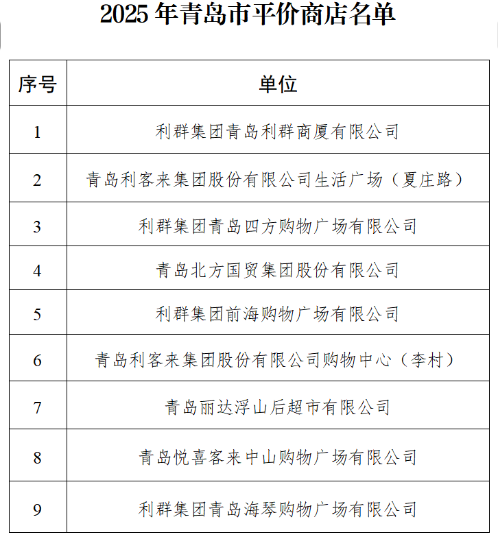 根据国家和省关于重要民生商品平价销售机制建设工作要求,为充分发挥平价商店在保供稳价、促进经济持续健康发展等方面的重要作用,市发展改革委评选认定利群集团青岛利群商厦有限公司等9家企业为“青岛市平价商店”。