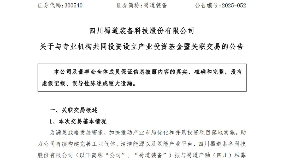 近日,四川蜀道装备科技股份有限公司(证券简称“蜀道装备”)公告称,公司拟与蜀道产融(四川)私募基金管理有限公司(以下简称“蜀道产融管理公司”)、蜀道(四川)股权投资基金有限公司(以下简称“蜀道股权基金公司”)共同投资设立蜀道(四川)气体产业股权投资基金(有限合伙),主要围绕工业气体(含特种气体、电子气体)、LNG、氢能领域设立子基金或开展直接股权投资。
