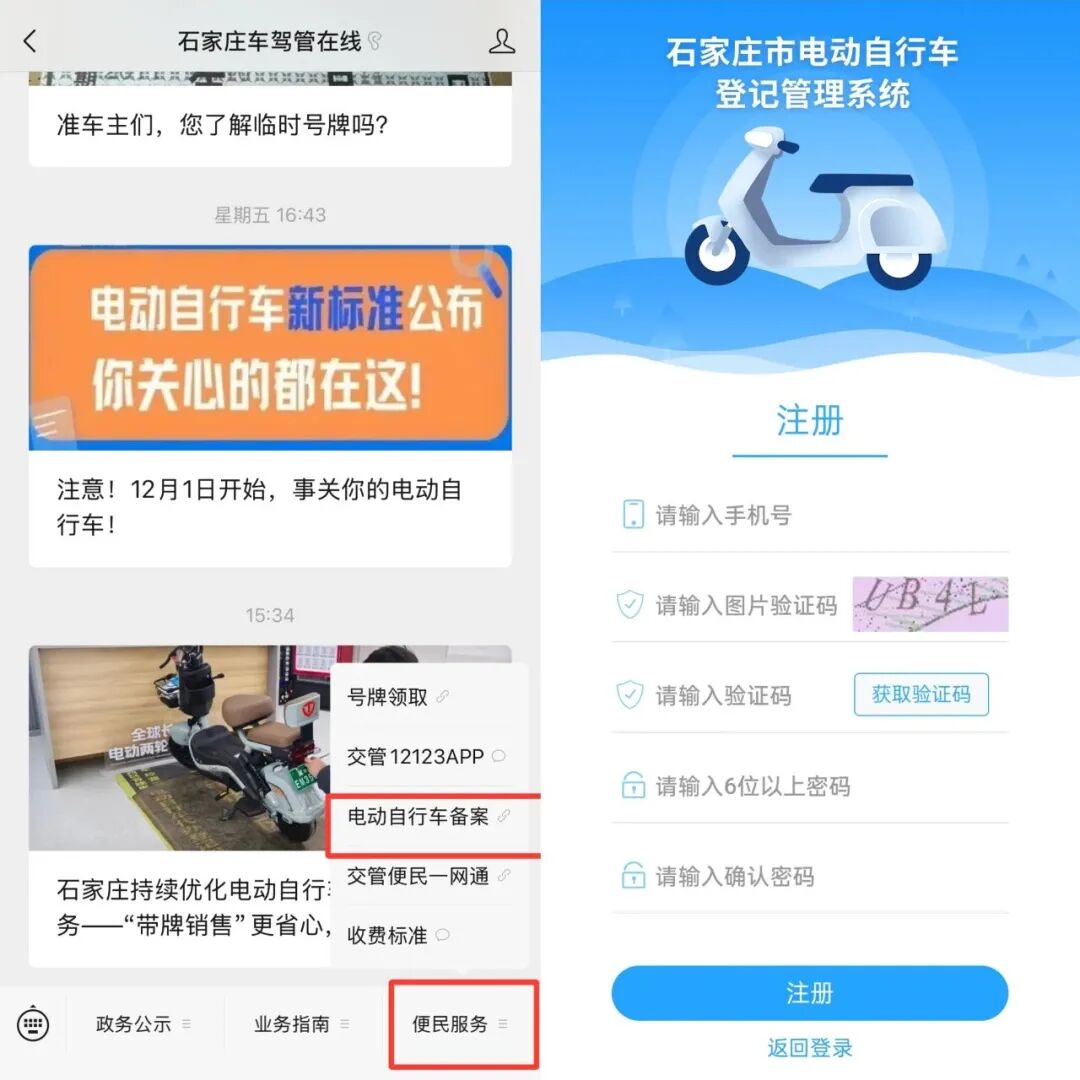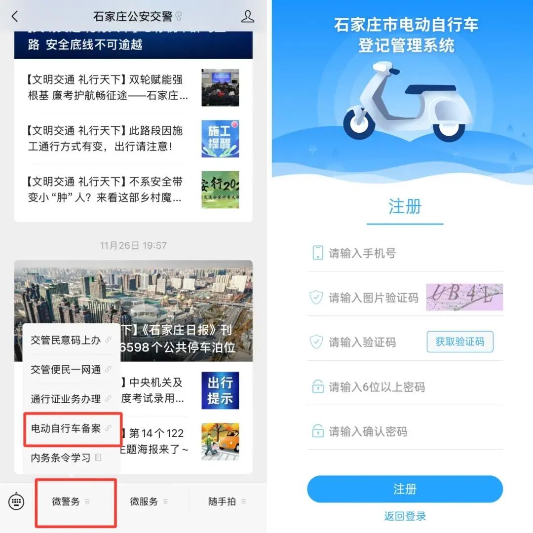 市民通过微信公众号“石家庄公安交警”→【微警务】→【电动自行车备案】,或“石家庄车驾管在线”→【便民服务】→【电动自行车备案】,进入“石家庄市电动自行车登记管理系统”。使用本人手机号注册,上传身份证正反面照片,完成个人信息登记。