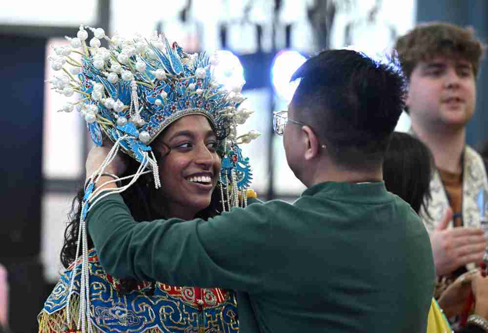 2024年12月30日,美国青少年“感知中国”研学团成员在河北省石家庄市京剧团体验。新华社发(陈其保摄)