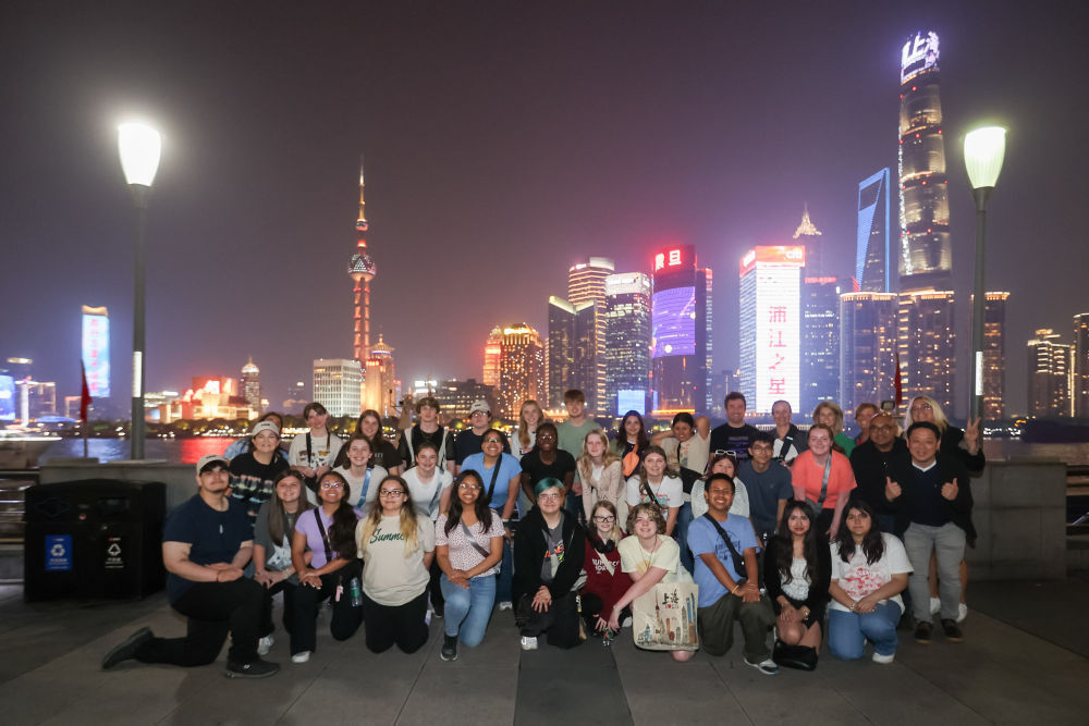 2024年4月23日,马斯卡廷中学“友谊传承”研学团师生在上海外滩合影。新华社记者 王翔 摄