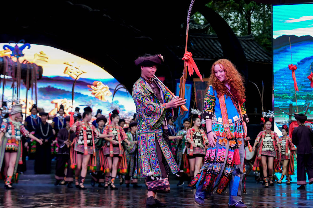 2024年9月16日,美国青年学生在贵州省西江千户苗寨体验民族歌舞。新华社发