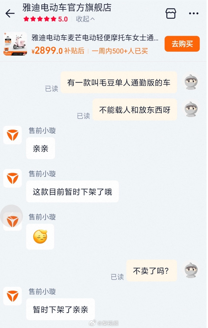 记者针对“雅迪新国标电动车争议”一事询问客服,雅迪电动车官方旗舰店客服回应称,涉事电动车车型已暂时下架,暂未接到上架通知,线下门店是否在售尚不清楚。问及该款车型是否因吐槽太多而被下架,客服未正面回应,仅回复一个笑哭表情。