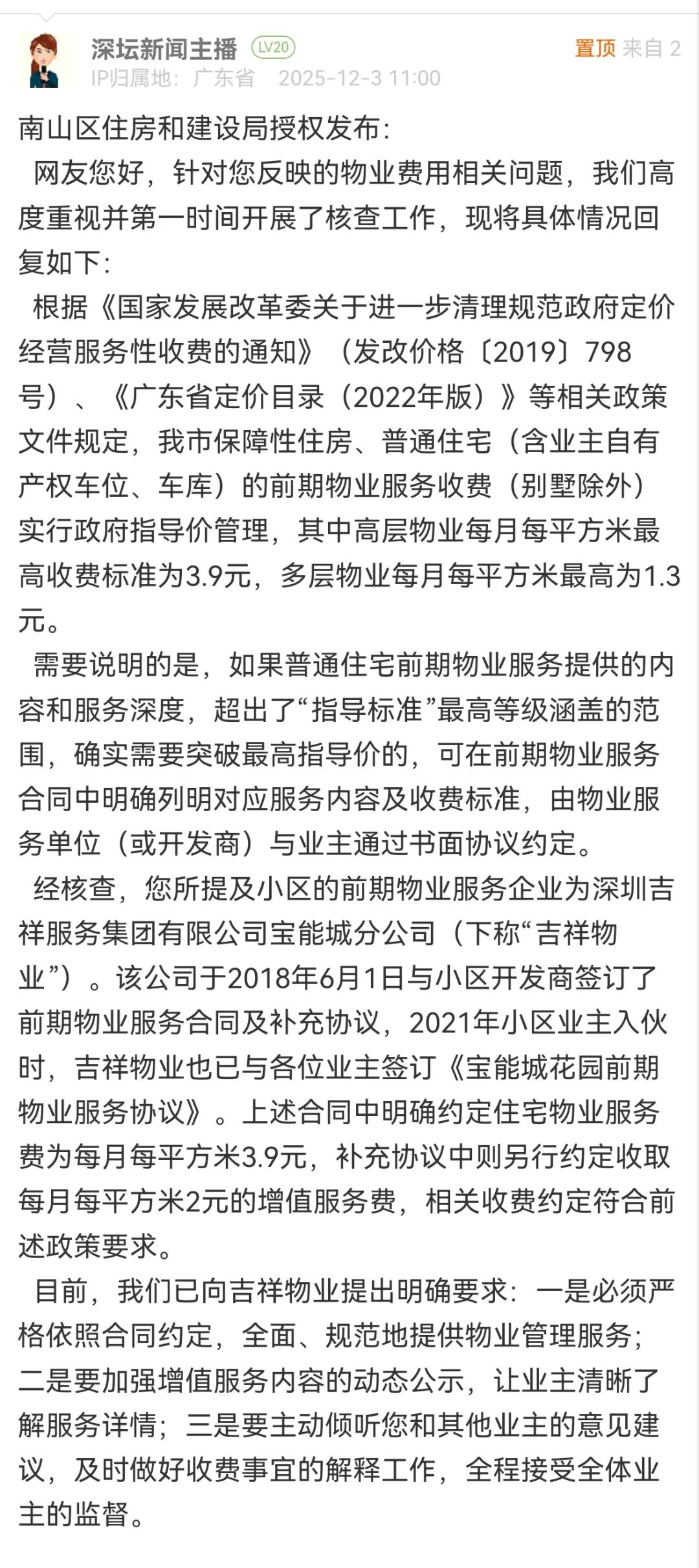 目前,南山区住房和建设局已向吉祥物业提出明确要求: