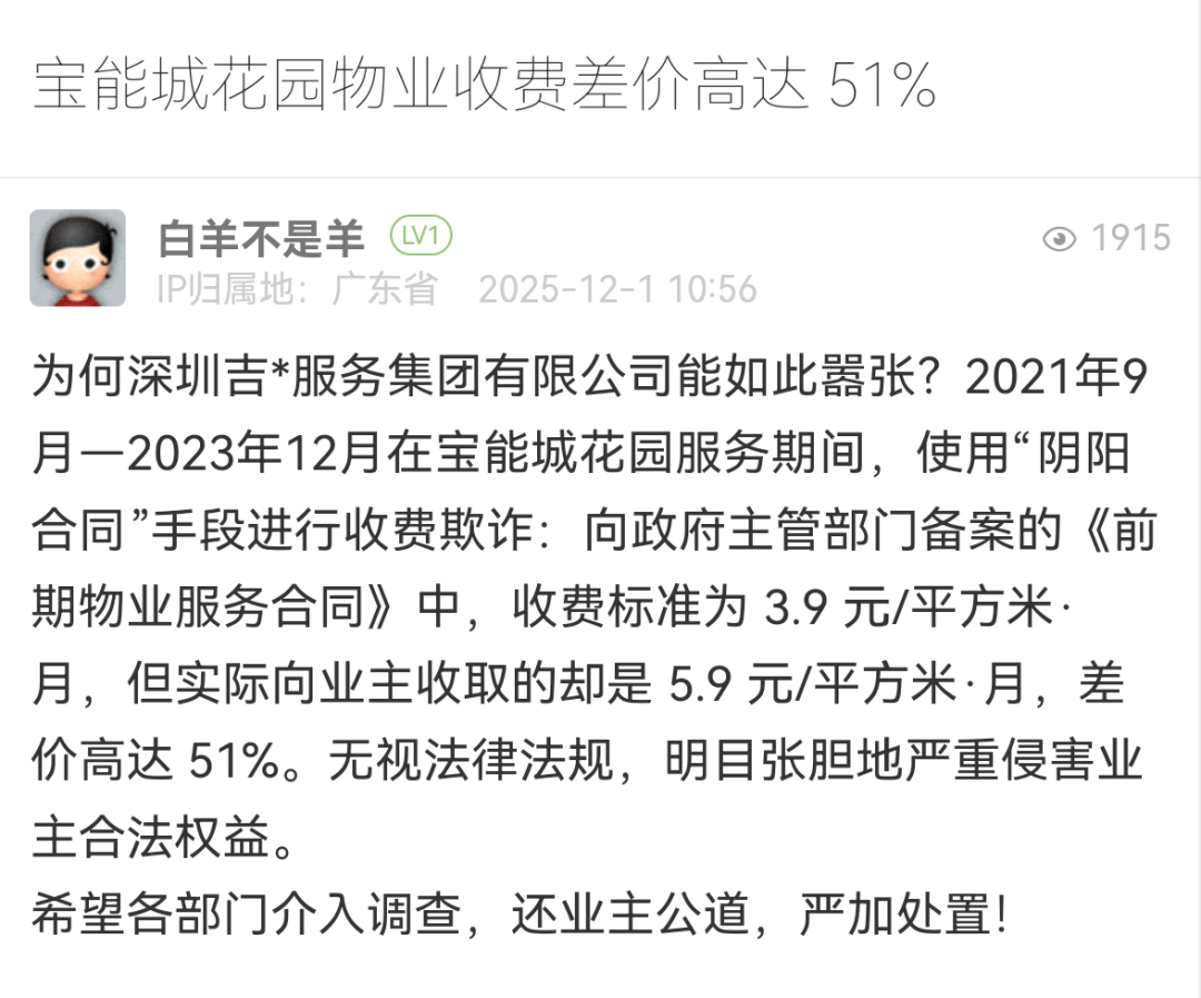 该市民称,深圳吉*服务集团有限公司2021年9月—2023年12月在宝能城花园服务期间,使用“阴阳合同”手段进行收费欺诈:向政府主管部门备案的《前期物业服务合同》中,收费标准为3.9元/平方米·月,但实际向业主收取的却是5.9 元/平方米·月,差价高达51%。无视法律法规,明目张胆地严重侵害业主合法权益。希望各部门介入调查,还业主公道,严加处置!