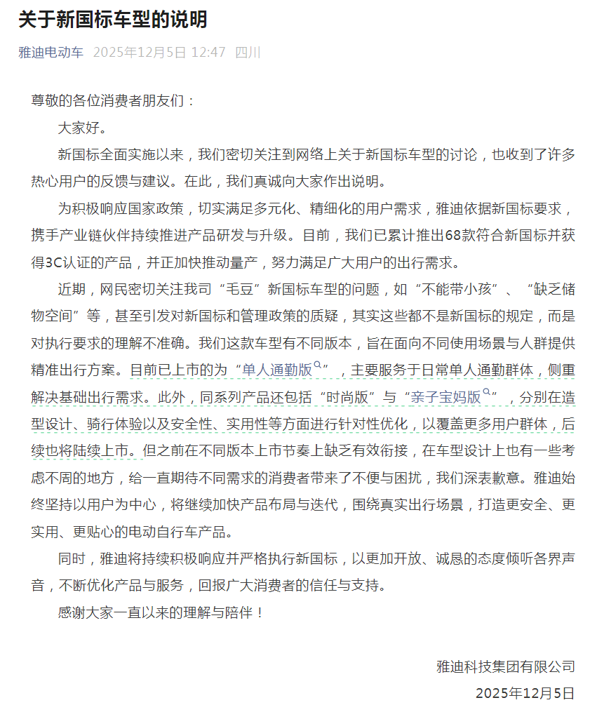12月5日中午,雅迪科技集团有限公司发布《关于新国标车型的说明》,表示该公司生产的“毛豆”电动车(“单人通勤版”)在车型设计上有一些考虑不周的地方,给消费者带来了不便与困扰,对此深表歉意。