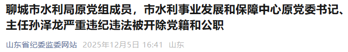 据聊城市纪委监委消息:经聊城市委批准,聊城市纪委监委对聊城市水利局原党组成员,市水利事业发展和保障中心原党委书记、主任孙泽龙严重违纪违法问题进行了立案审查调查。