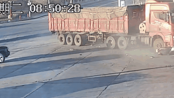 当日8时48分,于运在驾车上班途中行驶至西水易昌加油站路口时,突然传来刺耳的刹车声和“嘭”的一声巨响。他猛踩刹车,只见一辆重型货车斜停在路旁,车头下的电动车已被碾压变形,零件散落一地,一名男子蜷缩在车轮旁,右脚死死卡在货车前保险杠与轮胎的缝隙中,鲜血正顺着裤管往外渗出,意识模糊中发出微弱的呻吟。
