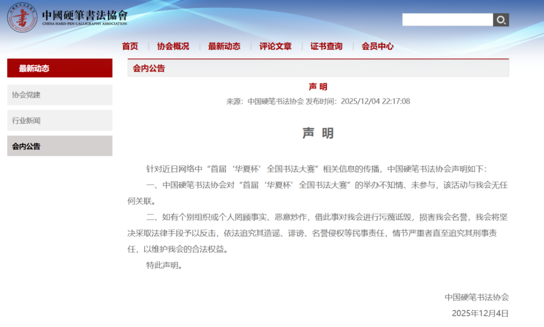 12月4日,中国硬笔书法协会网站发布《声明》,全文如下: