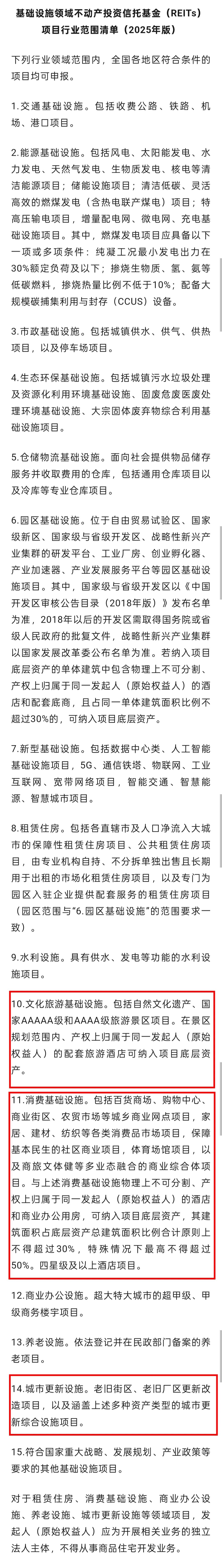 近日,国家发展改革委办公厅发布关于印发《基础设施领域不动产投资信托基金(REITs)项目行业范围清单(2025年版)》的通知。文旅行业领域范围内,全国各地区符合条件的项目均可申报。通知全文如下: