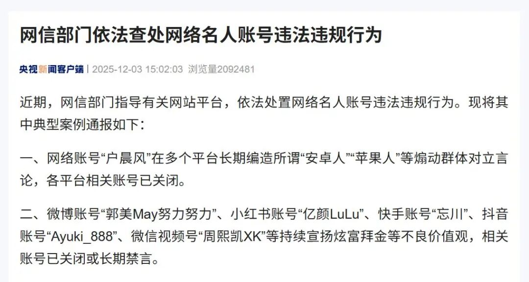 12月3日消息,日前网信部门联合各大网络平台开展了专项治理行动,依法对张雪峰、户晨风、郭美美等一批存在违法违规行为的网红主播账号进行处置并通报。
