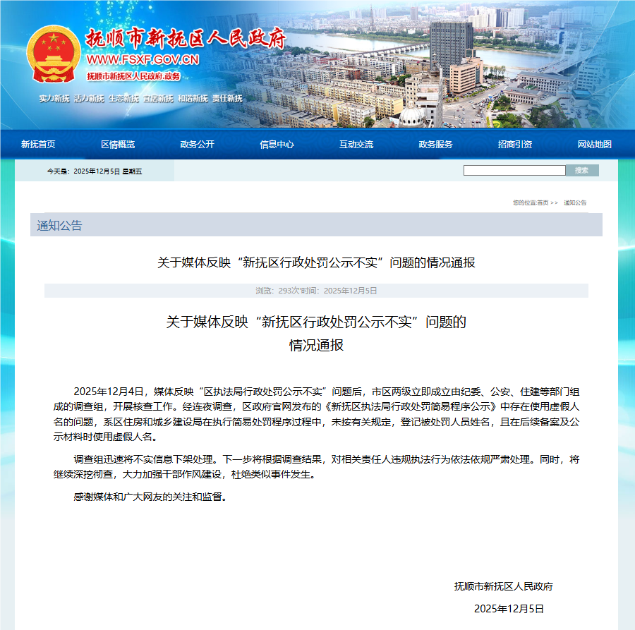 2025年12月4日,媒体反映“区执法局行政处罚公示不实”问题后,市区两级立即成立由纪委、公安、住建等部门组成的调查组,开展核查工作。经连夜调查,区政府官网发布的《新抚区执法局行政处罚简易程序公示》中存在使用虚假人名的问题,系区住房和城乡建设局在执行简易处罚程序过程中,未按有关规定,登记被处罚人员姓名,且在后续备案及公示材料时使用虚假人名。