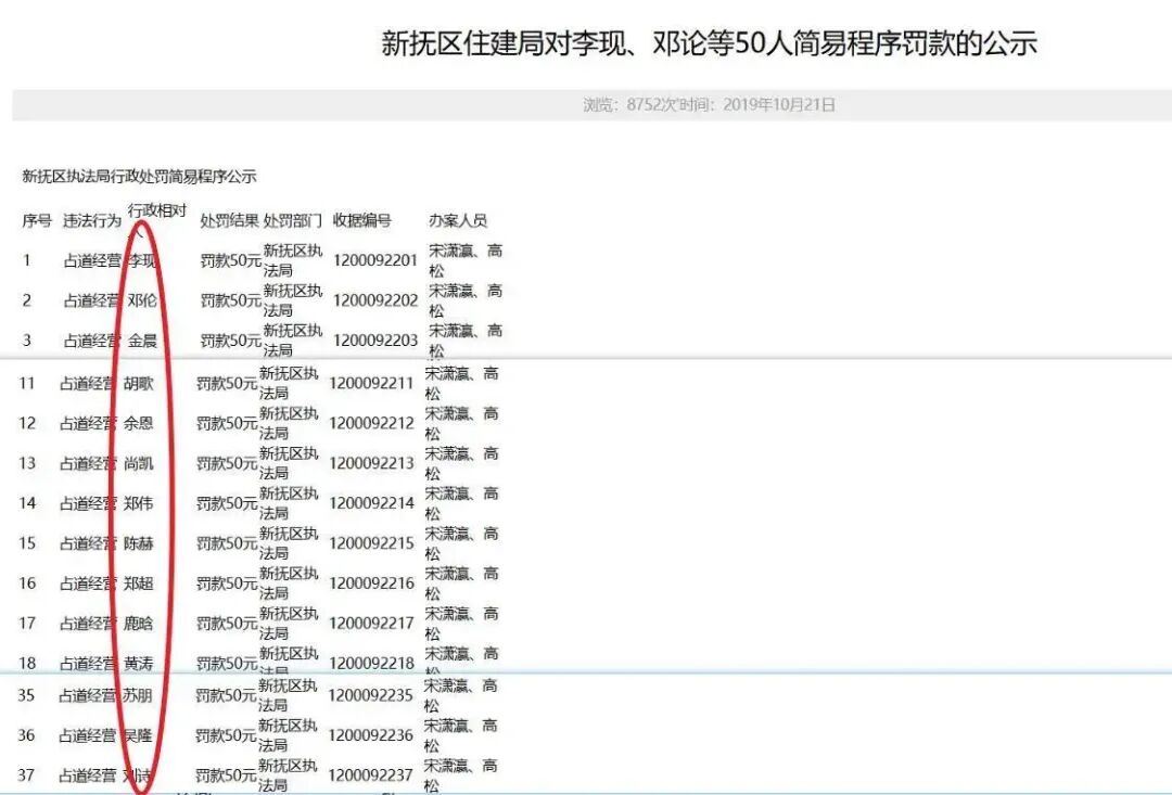 12月4日,有网友发现辽宁抚顺新抚区住建局于2019年10月21日公示的一占道经营处罚名单疑存猫腻,名单上的名字不但均为“姓氏+单名”的两字结构,而且还不少与知名艺人重名,如鹿晗、孙俪、李现、邓伦、金晨、董璇、杨颖等。