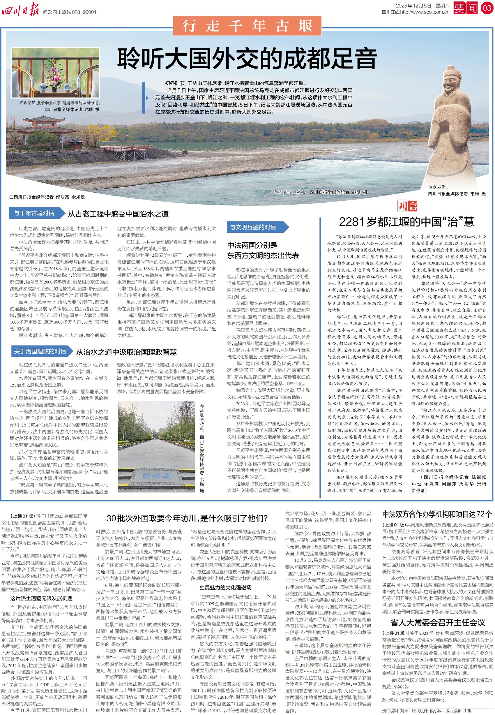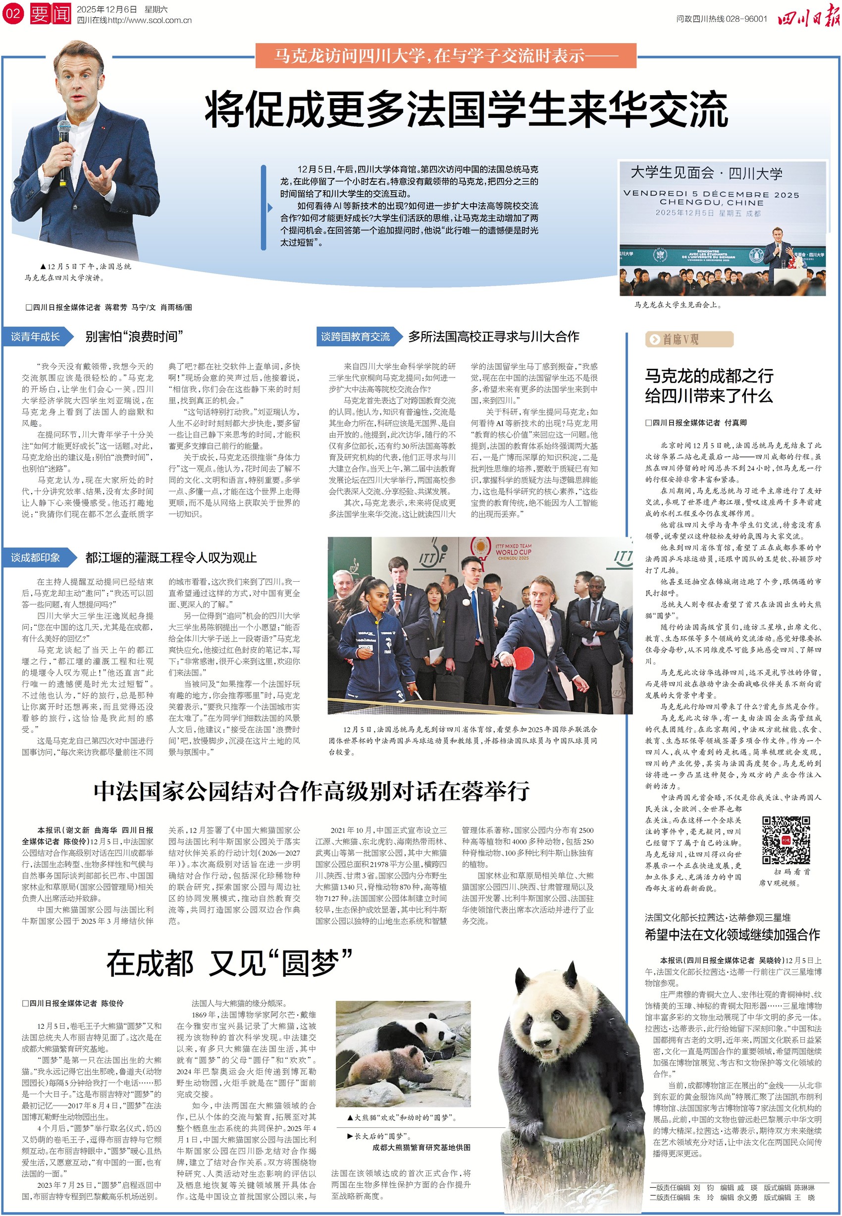 昨天,法国总统马克龙到访成都。虽然停留时间总共不到24小时,但行程安排非常丰富。在参观都江堰时,他赞叹这座运行了两千多年依然活力满满的水利工程。到访川大时,他特意没有系领带,希望以轻松友好的氛围与青年学生们交流。来到省体育馆,他看望中法乒乓球运动员,跟咱们的“莎头组合”对打了几拍。如此紧凑的行程中,他甚至还抽空在锦城湖边跑了个步。在川大回答学生提问时,他说“此行唯一的遗憾是时光太过短暂”。今日二、三版,带你复盘短暂行程中的中法情缘与合作新机。
