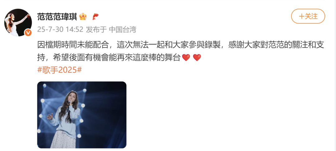 7月30日,范玮琪在社交平台发文:因档期时间未能配合,这次无法一起和大家参与录制,感谢大家对范范的关注和支持,希望后面有机会能再来这么棒的舞台。