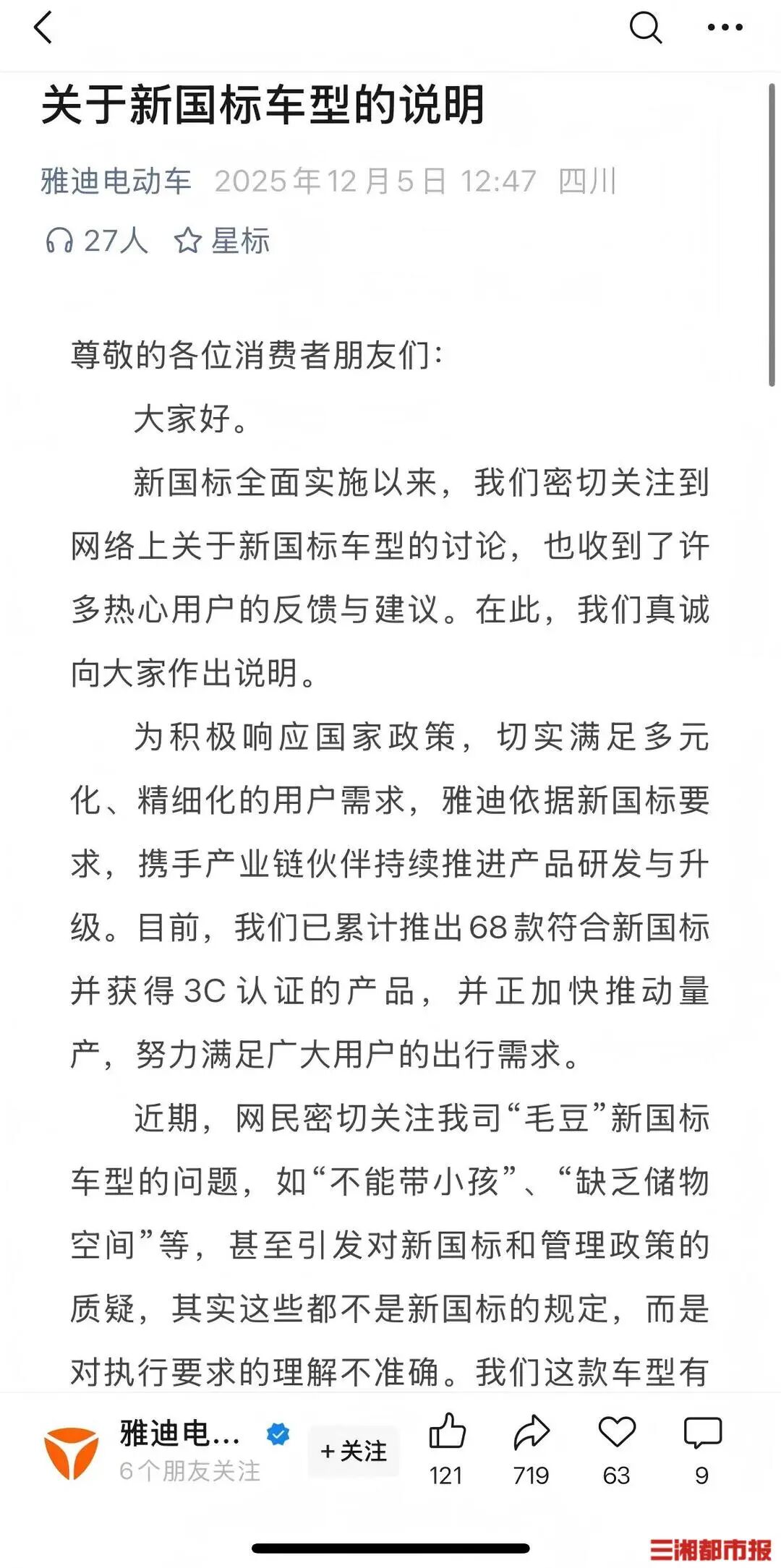 12月5日,雅迪电动车发布《关于新国标车型的说明》,称该公司“毛豆”新国标车型因“不能带小孩”“缺乏储物空间”引发网友关注,甚至引发对新国标和管理政策的质疑,其实这些都不是新国标的规定,而是对执行要求的理解不准确。公司称,这款车型有不同版本,目前已上市的为“单人通勤版”,主要服务于日常单人通勤群体,侧重解决基础出行需求。此外,同系列产品还包括“时尚版”与“亲子宝妈版”,后续将陆续上市。雅迪称,之前在不同版本上市节奏上缺乏有效衔接,在车型设计上也有一些考虑不周的地方,给一直期待不同需求的消费者带来了不便与困扰,对此深表歉意。