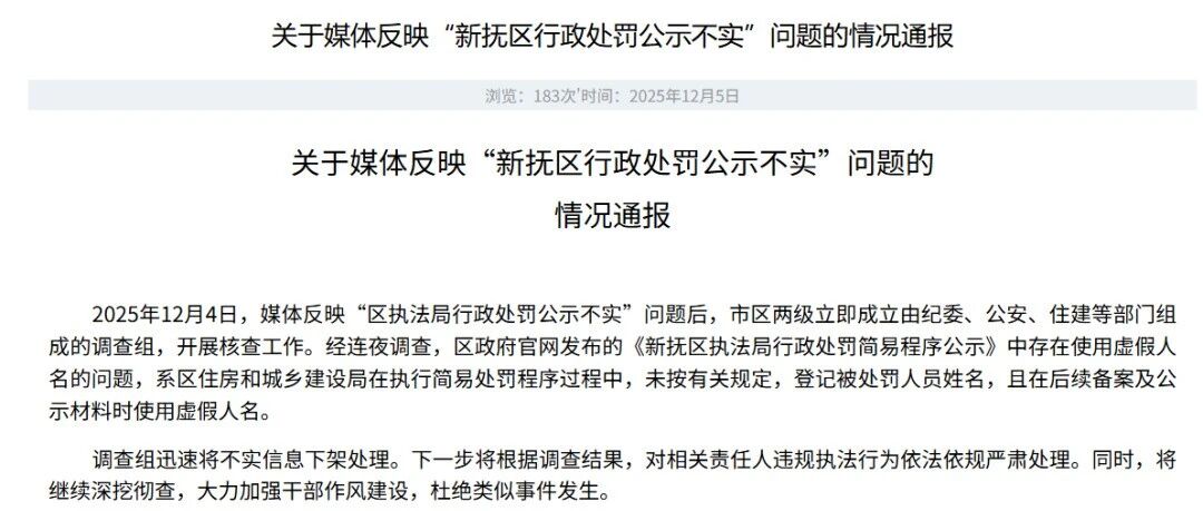 辽宁省抚顺市新抚区人民政府12月5日发布关于媒体反映“新抚区行政处罚公示不实”问题的情况通报:12月4日,媒体反映“区执法局行政处罚公示不实”问题后,市区两级立即成立由纪委、公安、住建等部门组成的调查组,开展核查工作。经连夜调查,区政府官网发布的《新抚区执法局行政处罚简易程序公示》中存在使用虚假人名的问题,系区住房和城乡建设局在执行简易处罚程序过程中,未按有关规定,登记被处罚人员姓名,且在后续备案及公示材料时使用虚假人名。