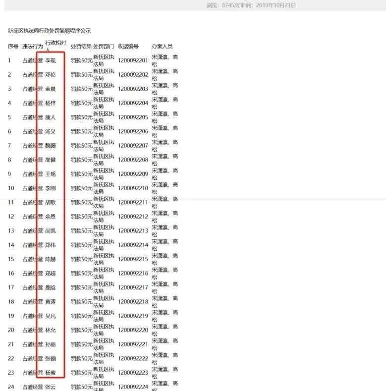 12月4日,有网友反映,辽宁抚顺新抚区住建局于2019年公示的一占道经营处罚名单中,多个名字与知名艺人重名。12月5日,抚顺新抚区政府办回应澎湃新闻,已成立调查组调查。