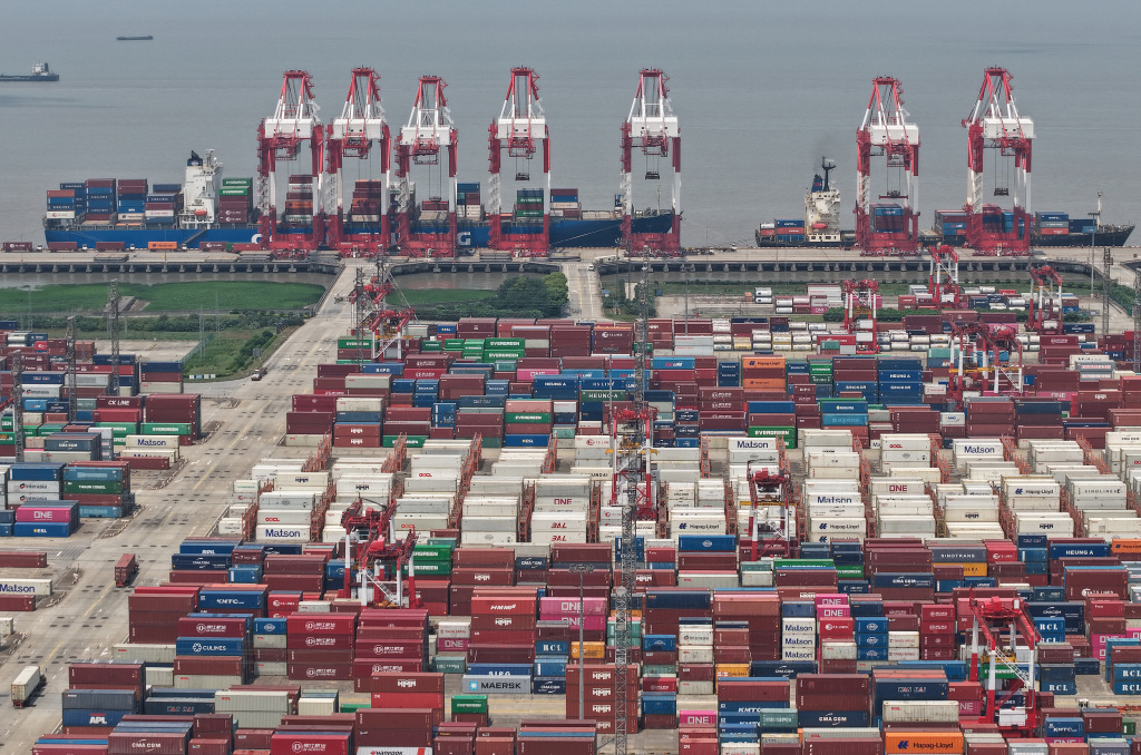 2025年10月24日,上海港集装箱码头车来船往,作业繁忙。视觉中国 图