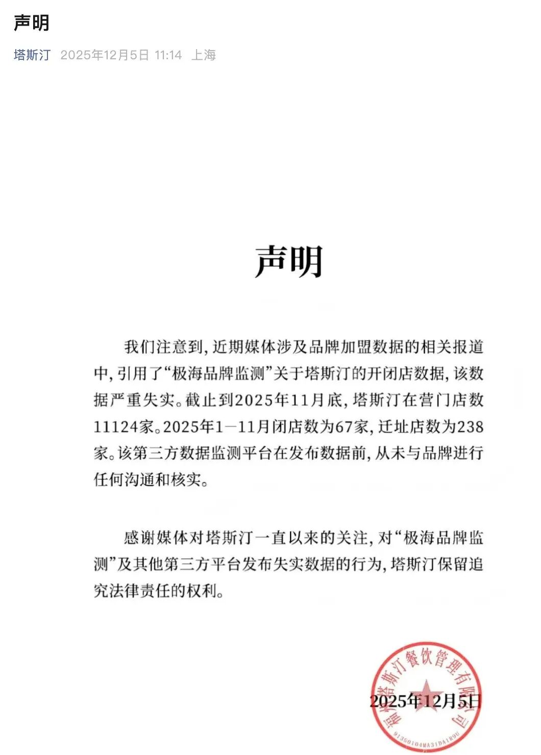 声明表示,感谢媒体对塔斯汀一直以来的关注,对“极海品牌监测”及其他第三方平台发布失实数据的行为,塔斯汀保留追究法律责任的权利。