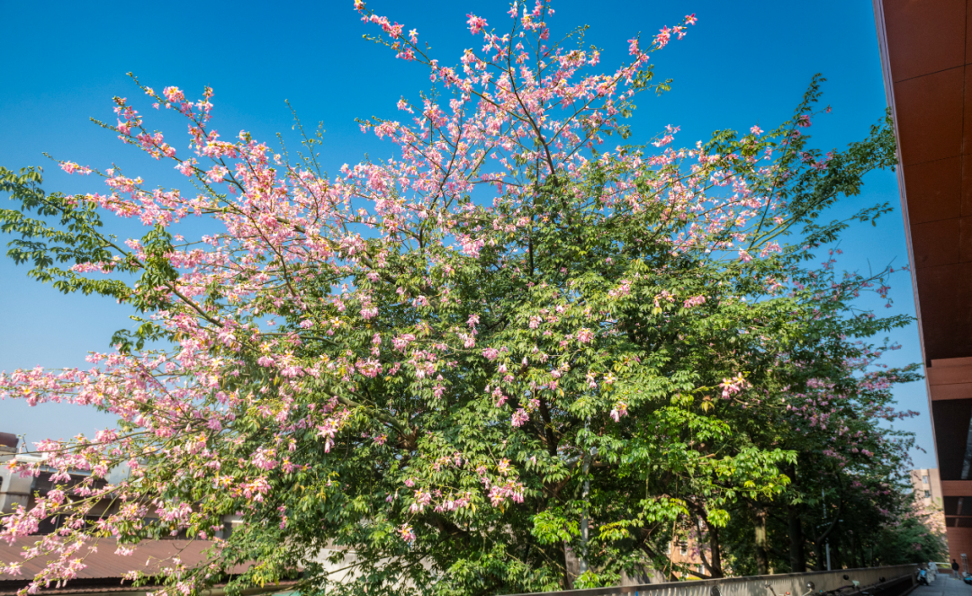 12月5日,美丽异木棉粉色的花瓣缀满枝头,在蓝天映衬下与翠绿枝叶组成美丽的画面。图/广州日报新花城记者:廖雪明