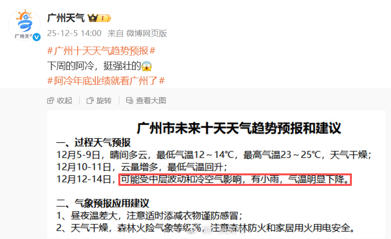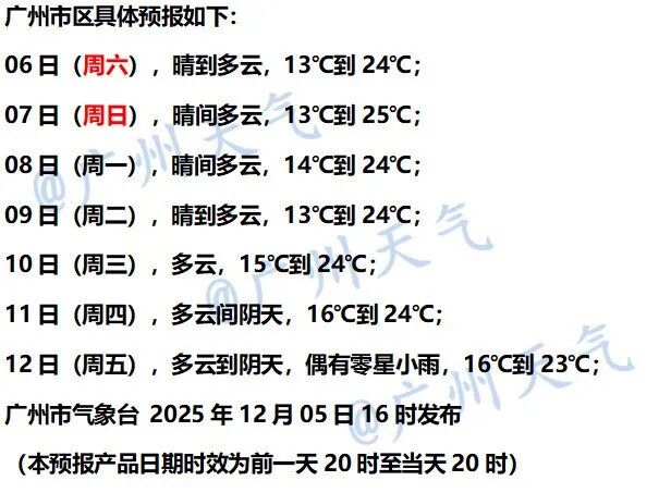 广州市气象台预计,12月6日—8日广州以晴朗干燥天气为主,最低气温13~14℃,最高气温24~25℃。12月12日开始,受冷空气影响,有小雨,气温明显下降。