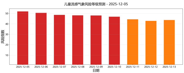 图1 2025年12月5日至12月13日天津市儿童流感气象风险指数预测趋势