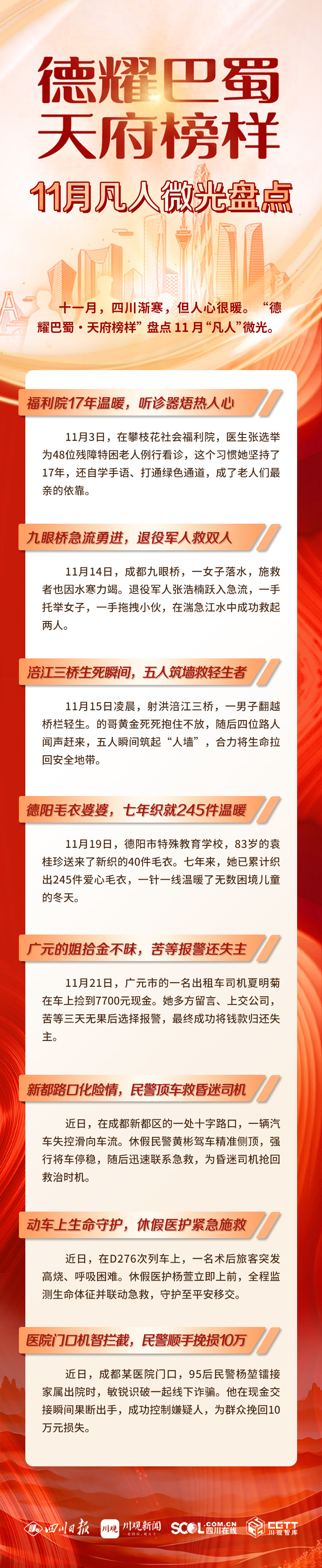十一月,四川渐寒,但人心很暖。“德耀巴蜀・天府榜样”盘点11月“凡人”微光,他们中有快递员、民警、出租车司机和热心市民,等等。在危急时刻挺身而出,他们用行动书写着不平凡的感动。让我们一同回顾这些温暖瞬间,感受平凡英雄带来的力量。