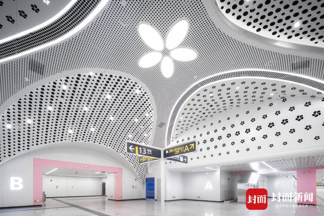 来到幸福梅林站,刚上扶梯就听取体验官“哇”声一片,车站整体空间以梅花为主要元素,漫反射灯光烘托出“游梦梅庭”的氛围。