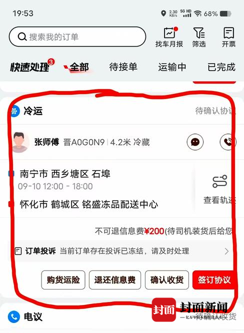 10月29日,重7.8吨、价值逾20万元的冷冻猪脚,在广西南宁装车,目的地为广东佛山。接单的货车,车牌号为晋A0G0N9,由发运者高先生托人通过网上平台下单。