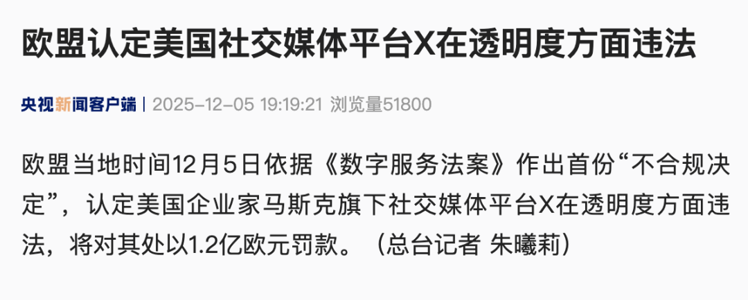欧盟当地时间12月5日依据《数字服务法案》作出首份“不合规决定”,认定美国企业家马斯克旗下社交媒体平台X在透明度方面违法,将对其处以1.2亿欧元罚款。