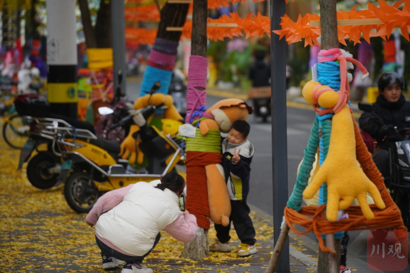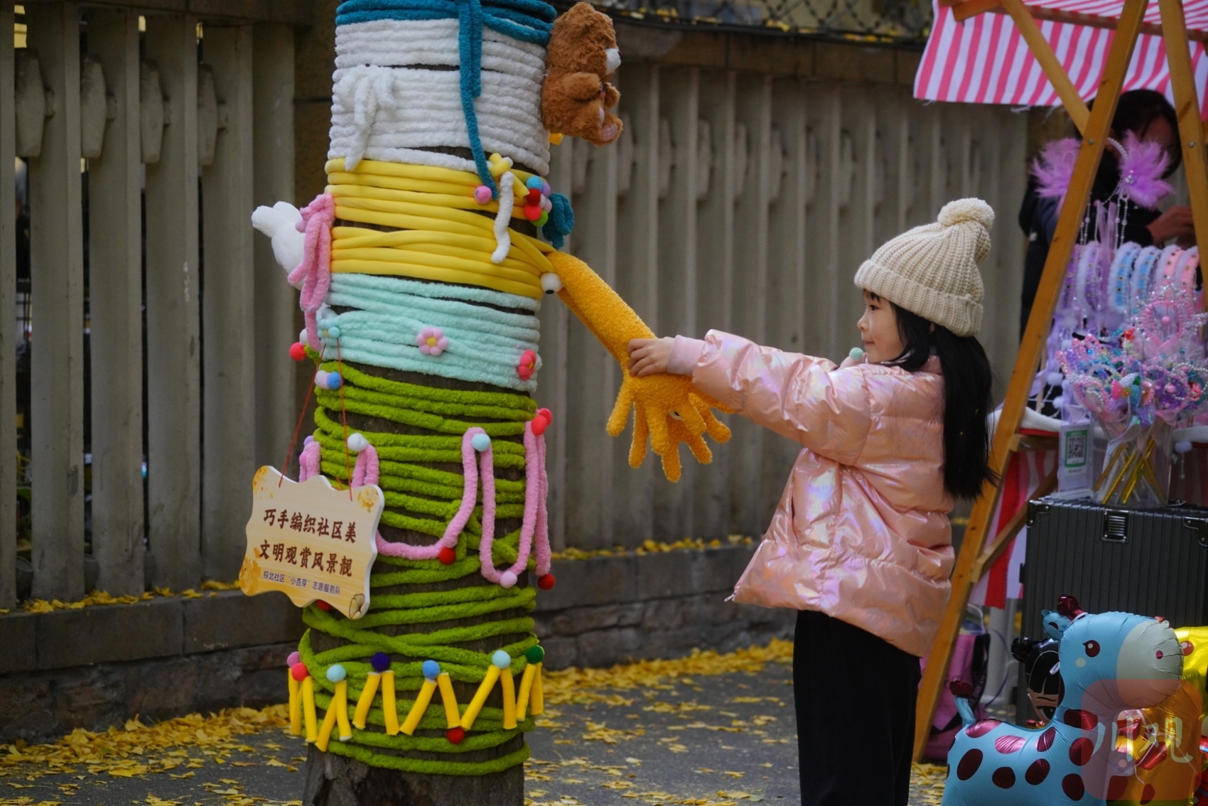 冬日,成都高新区兴蓉北街的银杏树披上了手工编织的“彩衣”。这些毛衣图案多样,有心形、花纹、小动物,有的还缀着可摆弄的玩偶手。它们出自社区上百名居民、学生之手,一针一线间编织进浓浓的邻里温情。