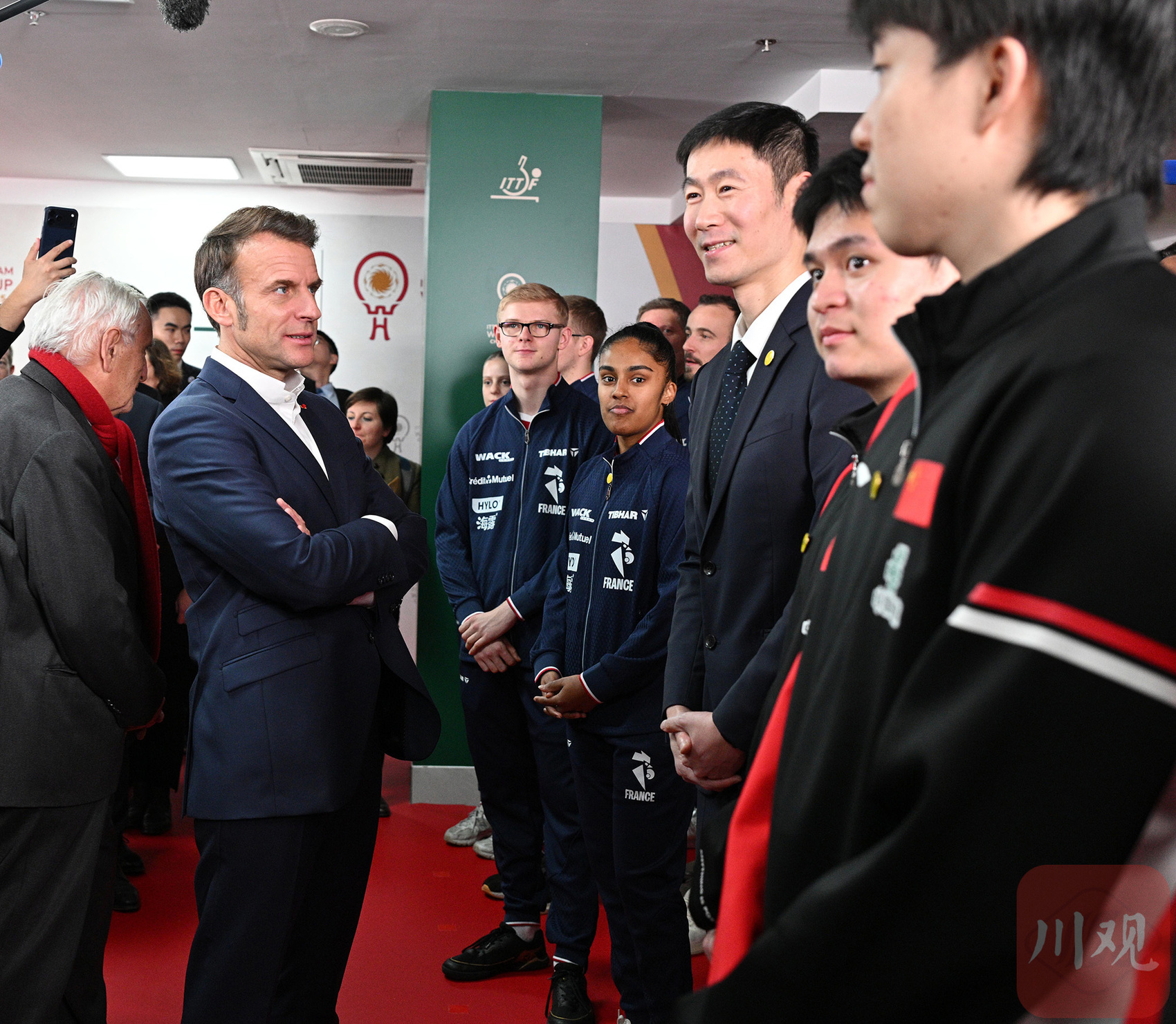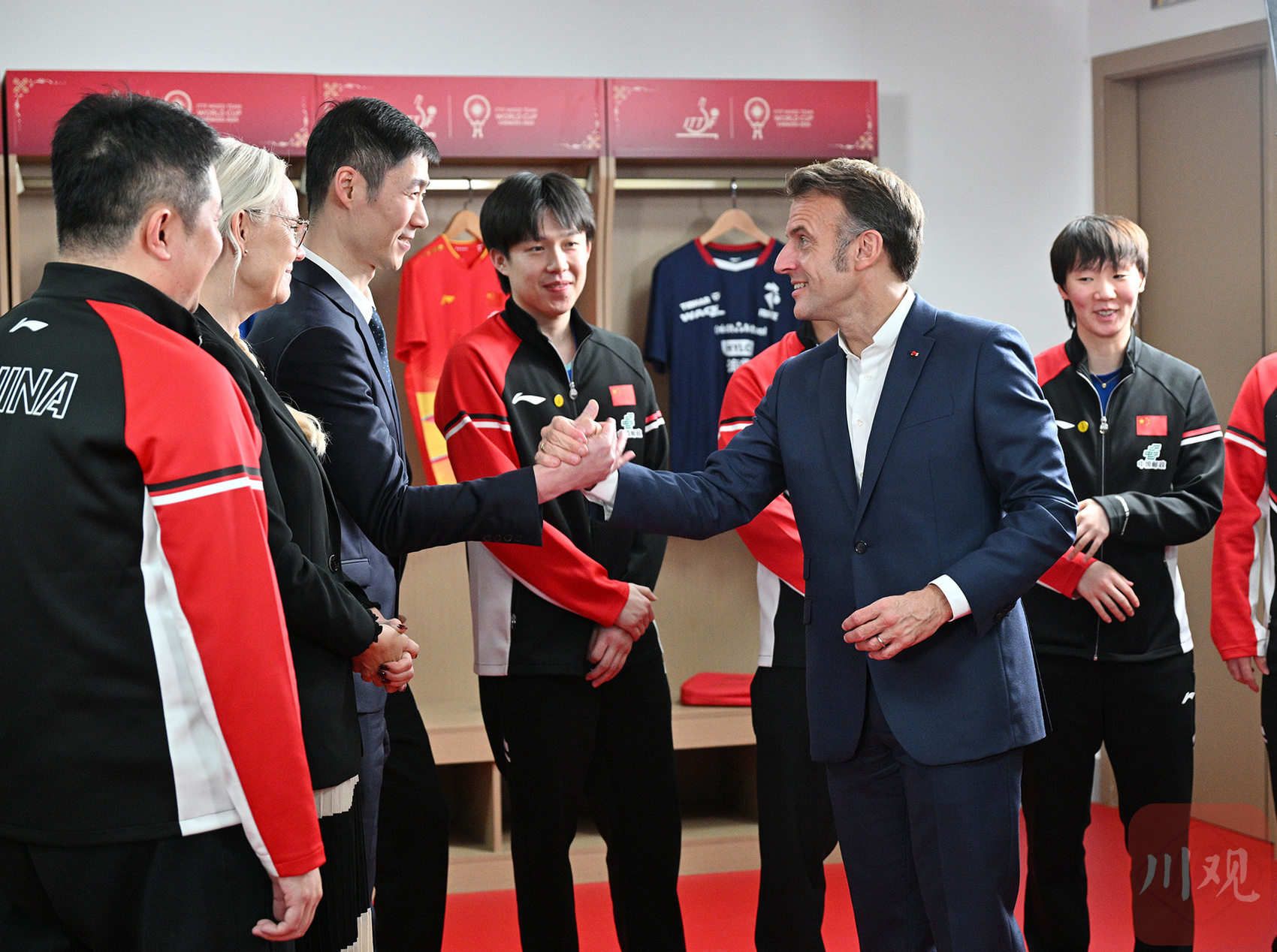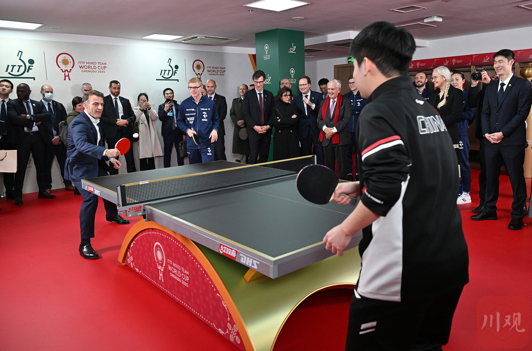 12月5日下午,法国总统马克龙前往四川省体育馆,看望参加2025年国际乒联混合团体世界杯的中法两国运动员与教练。