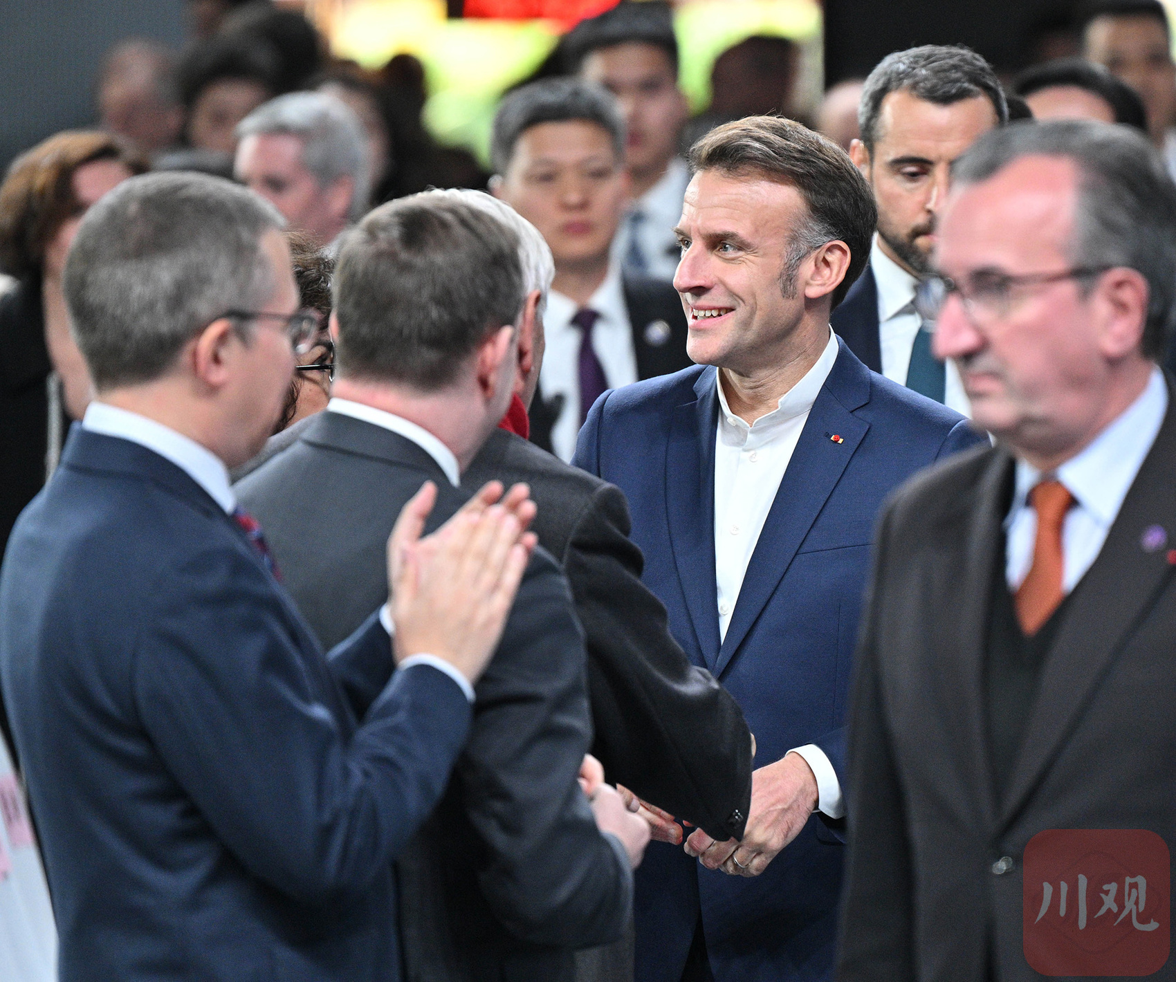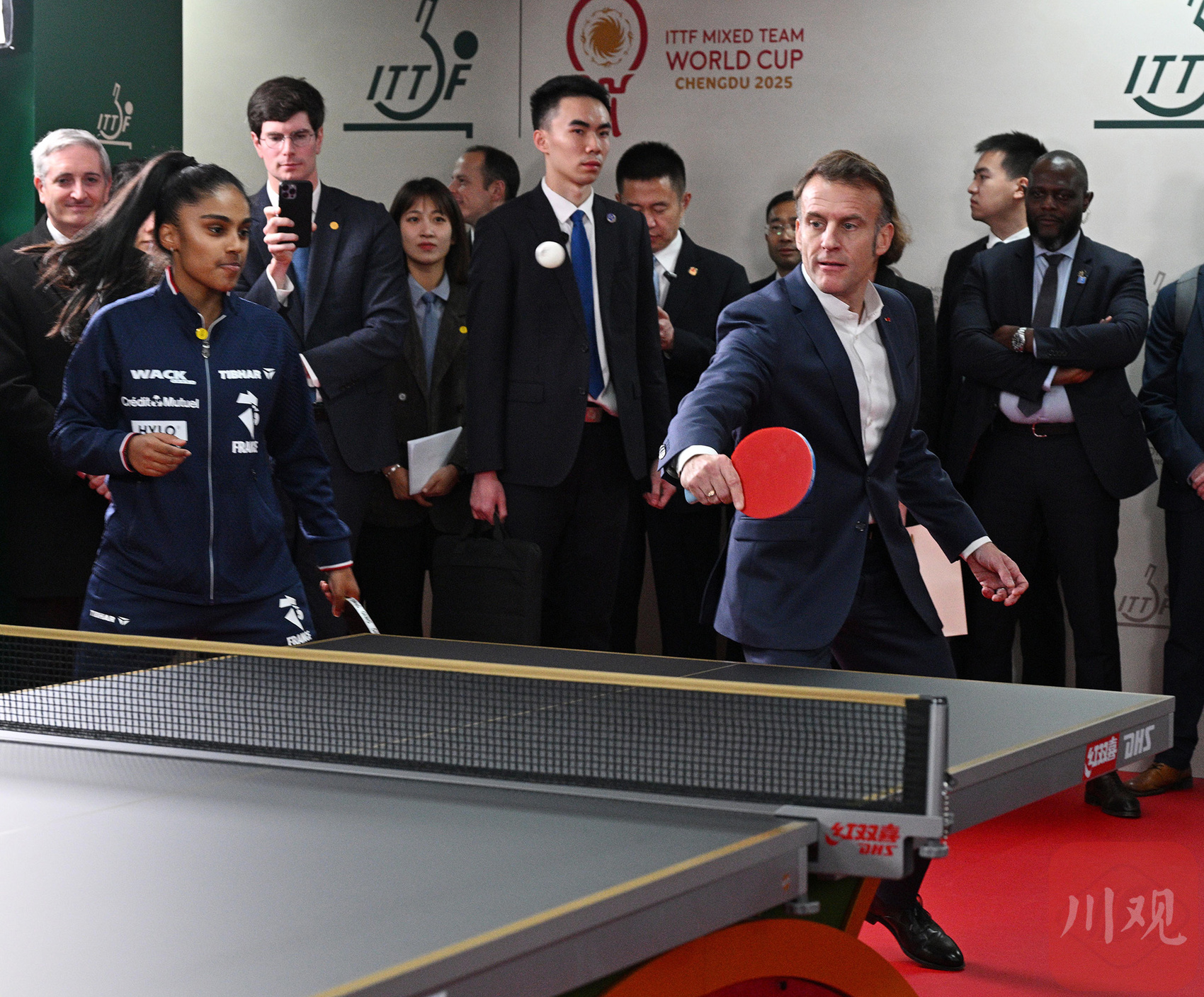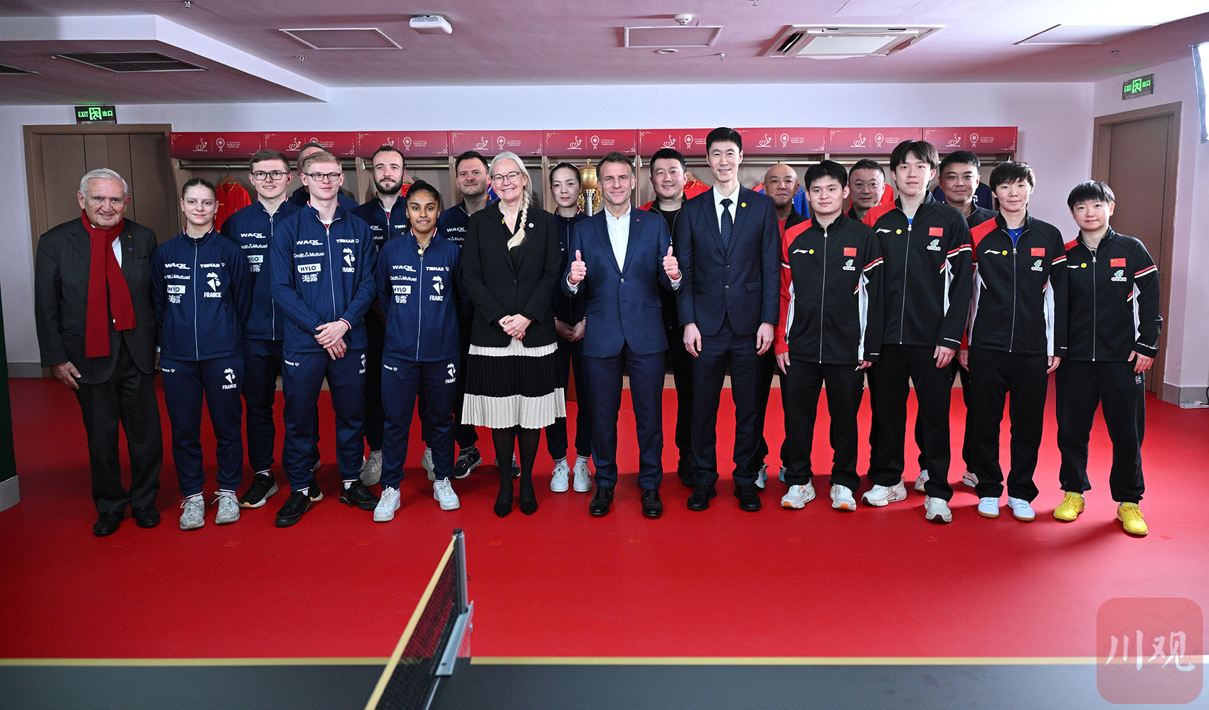 12月5日下午,法国总统马克龙前往四川省体育馆,看望参加2025年国际乒联混合团体世界杯的中法两国运动员与教练。