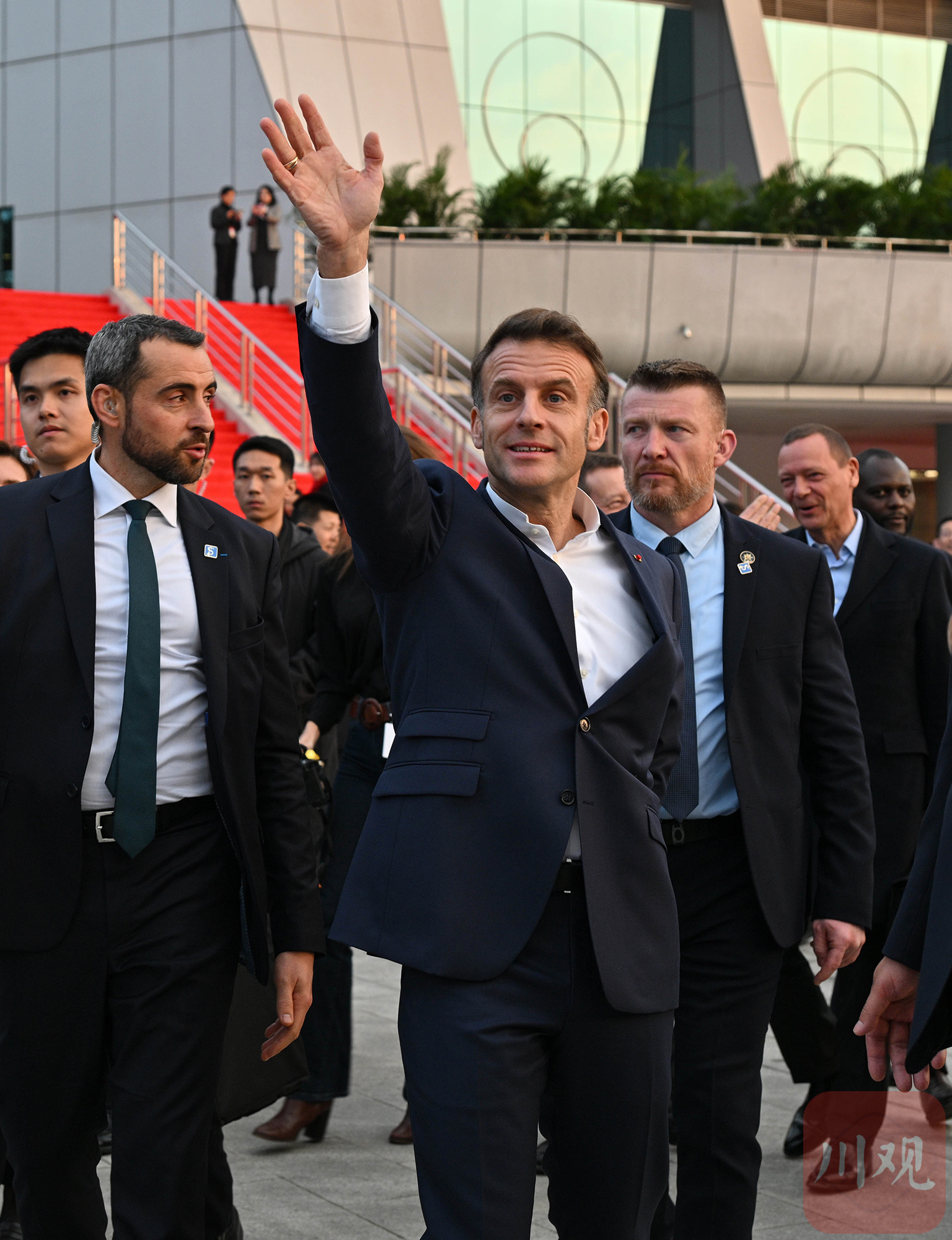 12月5日下午,法国总统马克龙访问四川大学。这是马克龙向四川大学学生挥手致意。