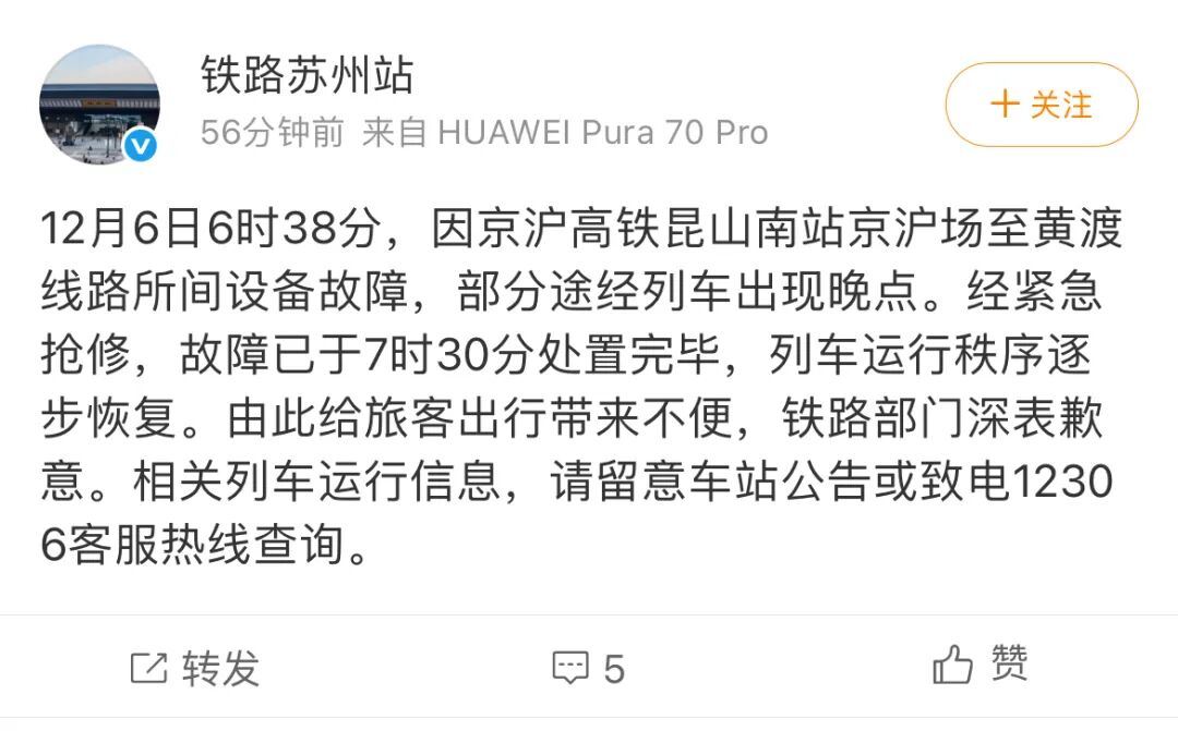 12月6日6时38分,因京沪高铁昆山南站京沪场至黄渡线路所间设备故障,部分途经列车出现晚点。经紧急抢修,故障已于7时30分处置完毕,列车运行秩序逐步恢复。由此给旅客出行带来不便,铁路部门深表歉意。相关列车运行信息,请留意车站公告或致电12306客服热线查询。