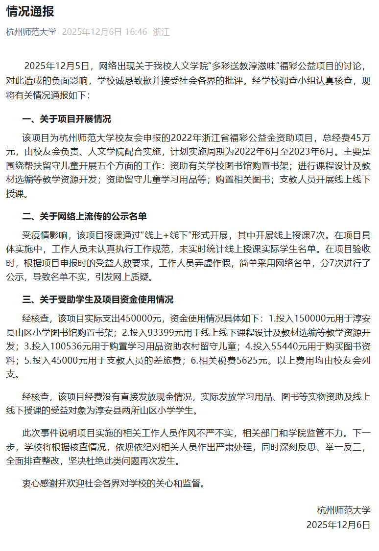 2025年12月5日,网络出现关于我校人文学院“多彩送教淳滋味”福彩公益项目的讨论,对此造成的负面影响,学校诚恳致歉并接受社会各界的批评。经学校调查小组认真核查,现将有关情况通报如下: