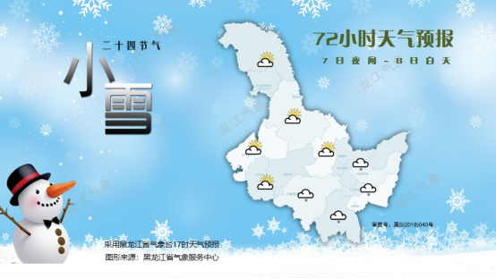 7日夜间到8日白天:哈尔滨、鹤岗、佳木斯、双鸭山、七台河、鸡西、牡丹江多云有阵雪,其它地区晴有时多云。