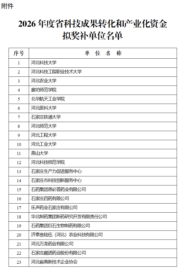 按照《河北省促进科技成果转化和产业化资金使用实施细则(暂行)》(冀科成市函〔2020〕65号)要求,现对2026年度省科技成果转化和产业化资金拟奖补单位进行公示(见附件),公示时间为2025年12月5日至2025年12月9日。